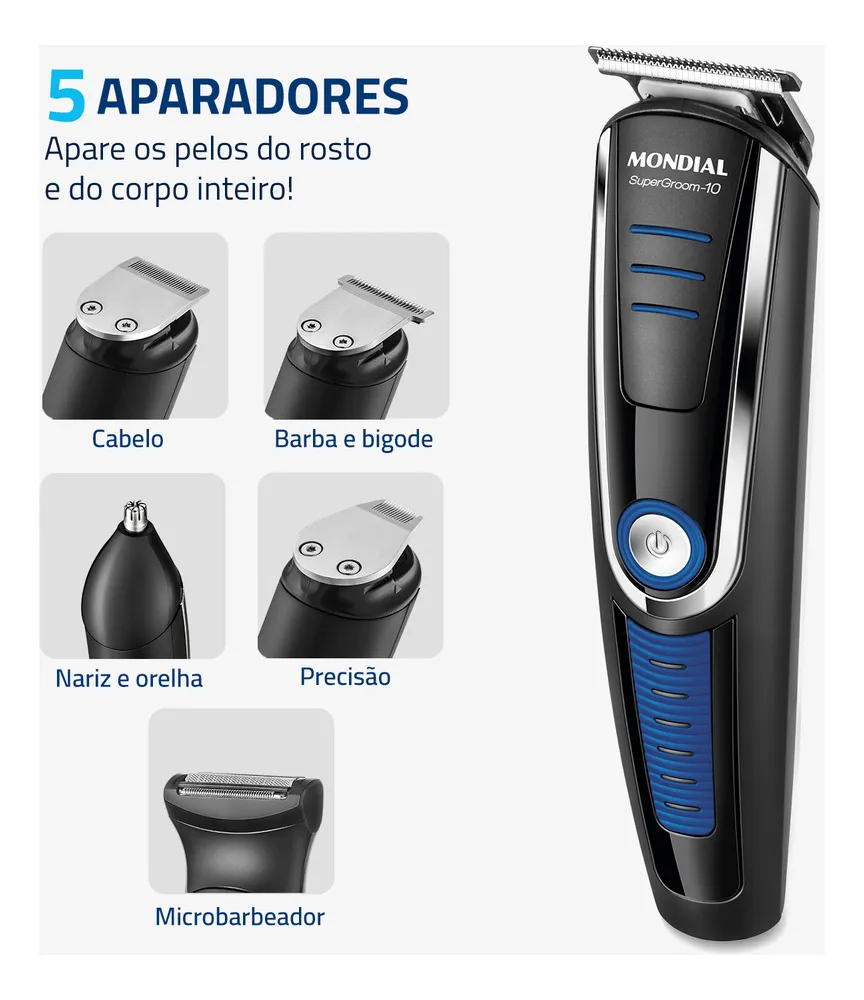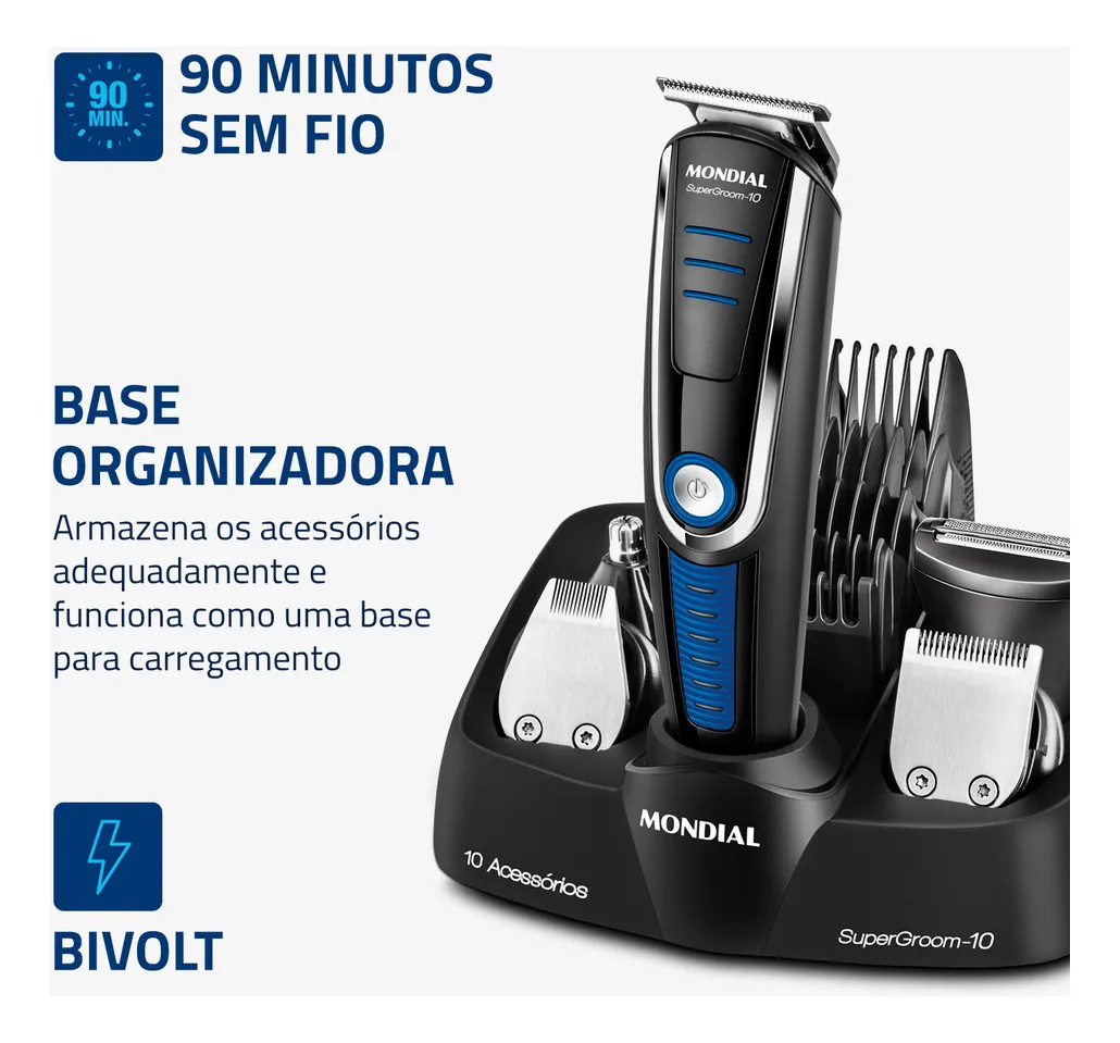 Cansado de ter vários aparelhos espalhados ou gastar fortunas na barbearia para ajustes simples? O Super Groom 10 da Mondial (BG-03) é a solução definitiva para o homem moderno que busca praticidade, precisão e estilo.