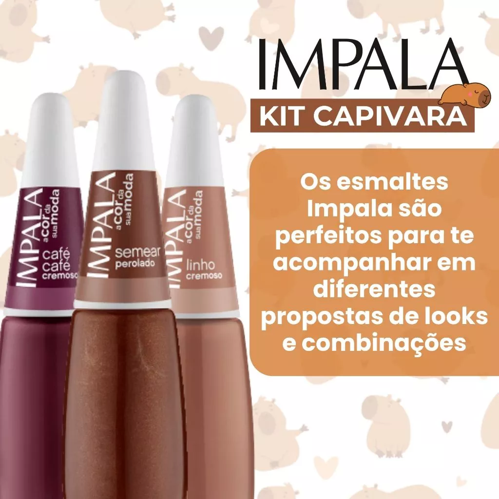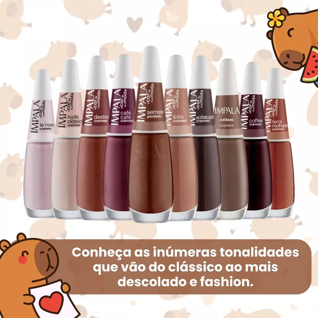 Cansada de procurar o marrom perfeito e nunca encontrar? Nós montamos a coleção definitiva para quem não abre mão da elegância. O Kit 10 Esmaltes Impala reúne a sofisticação dos nudes e o poder dos marrons terrosos, apresentando a estrela do momento: o icônico Capivara Ataca.