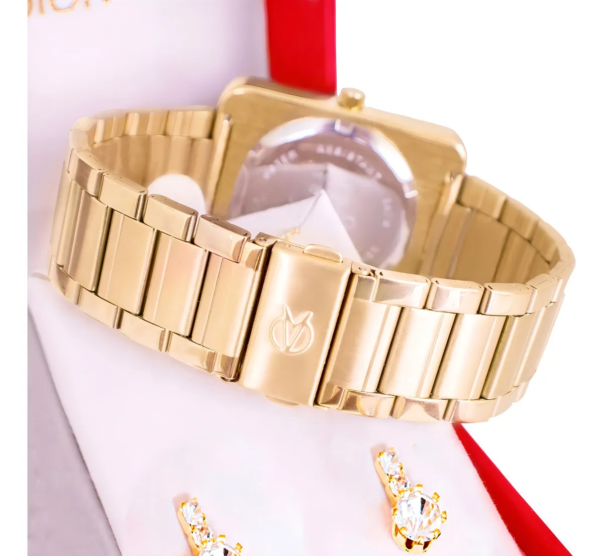 • Kit Joia Completo: Além do relógio, você leva um colar e um par de brincos selecionados para combinar com o dourado da peça, entregando um visual completo e harmonioso em uma única caixa de luxo.