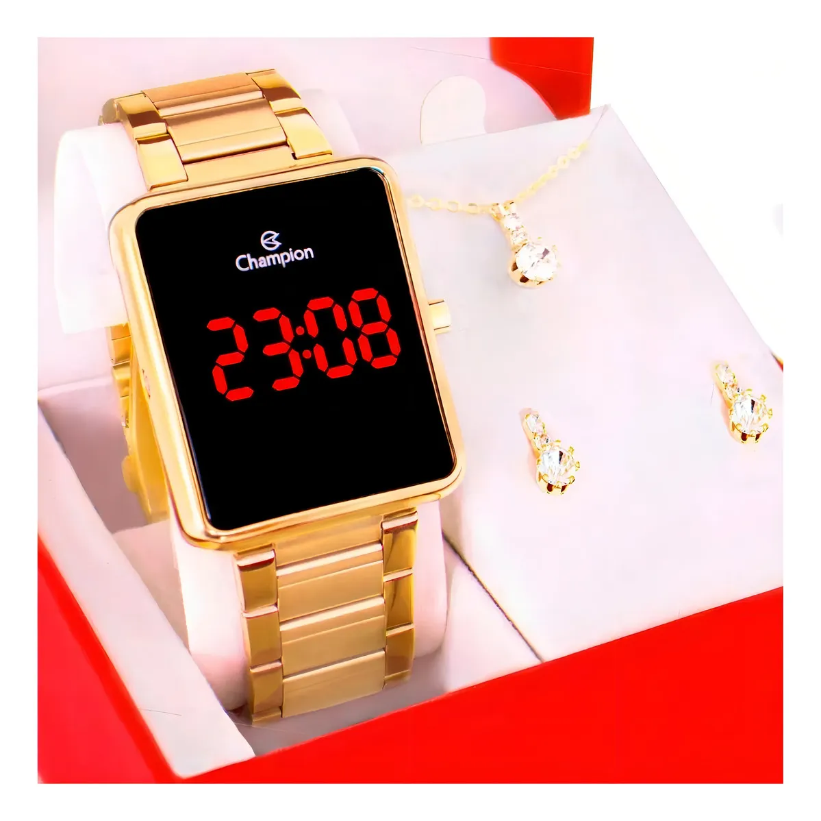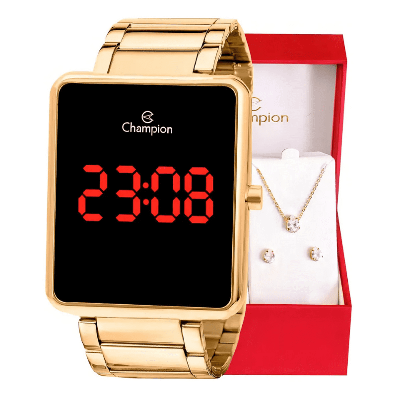 Kit Relógio Feminino Champion Digital Dourado Colar Brincos Cor do fundo led vermelho CH40086V Com Pulseira em Aço Inoxidável Presente Perfeito Namorada Mãe Esposa