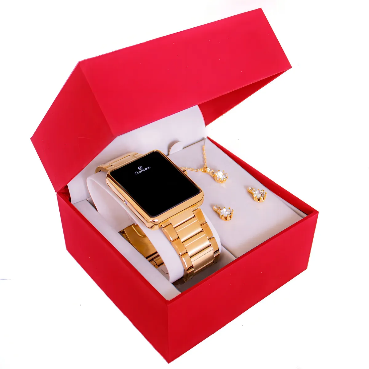 • Conteúdo do Kit: 1 Relógio Champion, 1 Colar, 1 Par de Brincos e Estojo Premium.