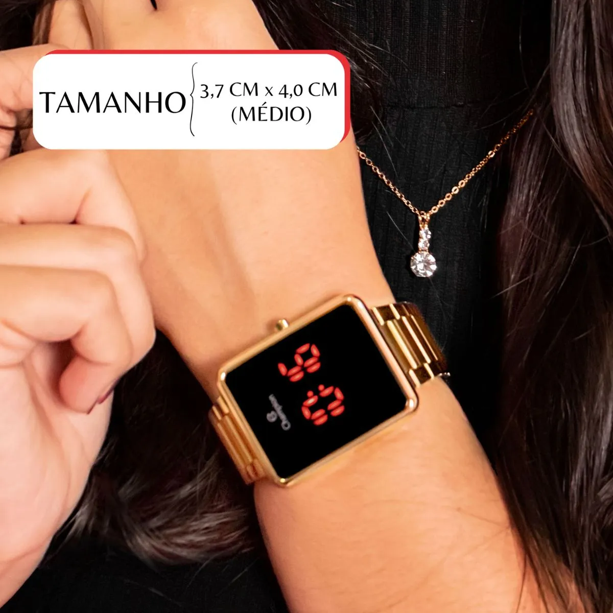 O LED vermelho traz uma energia de paixão e modernidade. Este relógio fica incrível quando usado com roupas pretas, brancas ou tons neutros, pois o visor se torna o protagonista do visual. Ao abrir a caixa, a surpresa do visor iluminado combinada com o brilho do colar e brincos cria um momento de “uau” garantido!