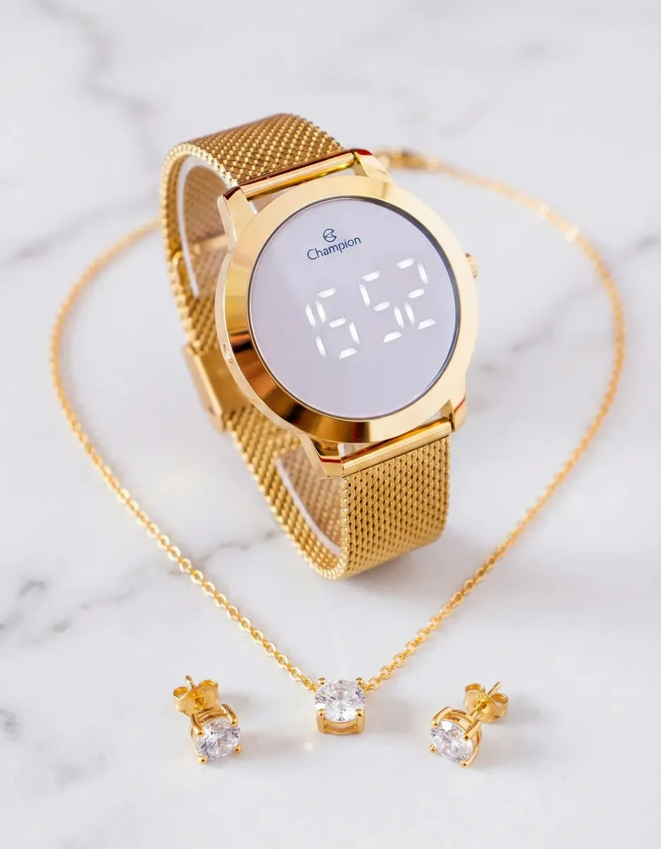 Seja o primeiro a avaliar “Kit Relógio Feminino Dourado Champion Digital Espelhado Colar E Brincos Com Correia em Aço Inoxidável Prova D´Agua 50 Metros”