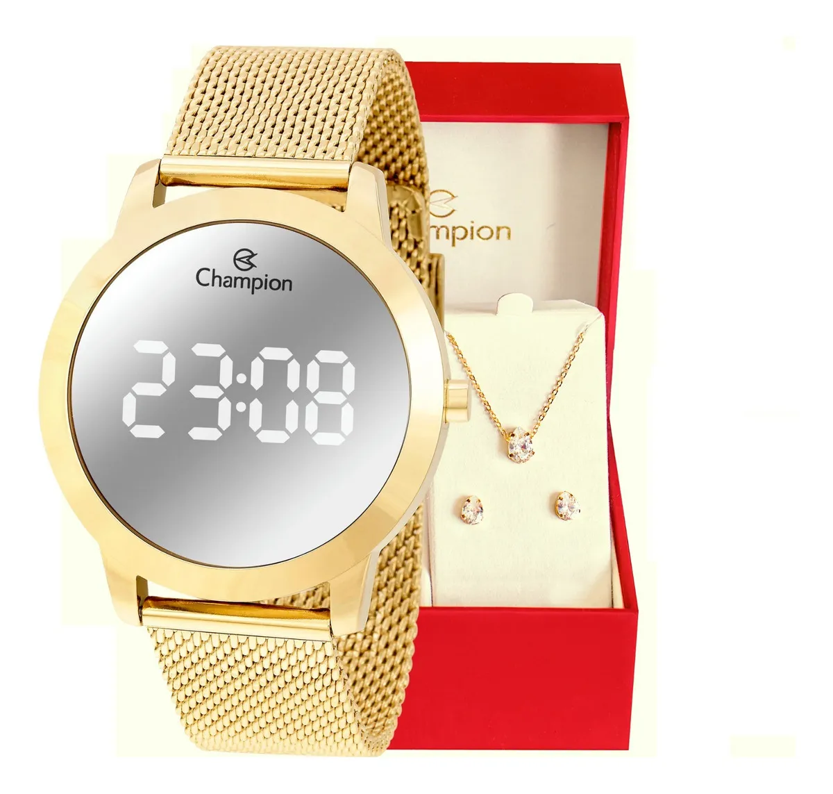 Kit Relógio Feminino Dourado Champion Digital Espelhado Colar E Brincos Com Correia em Aço Inoxidável Prova D´Agua 50 Metros Kit Relógio Feminino Dourado Champion Digital Espelhado Colar E Brincos Com Correia em Aço Inoxidável Prova D´Agua 50 Metros