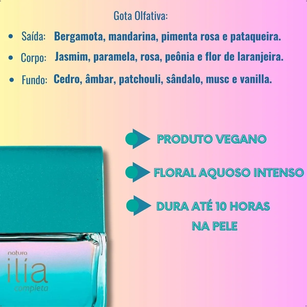 Frescor que Encanta: Se você gosta de florais que trazem uma sensação de “banho de luxo” e elegância limpa, o Ilía Completa vai te conquistar na primeira borrifada.