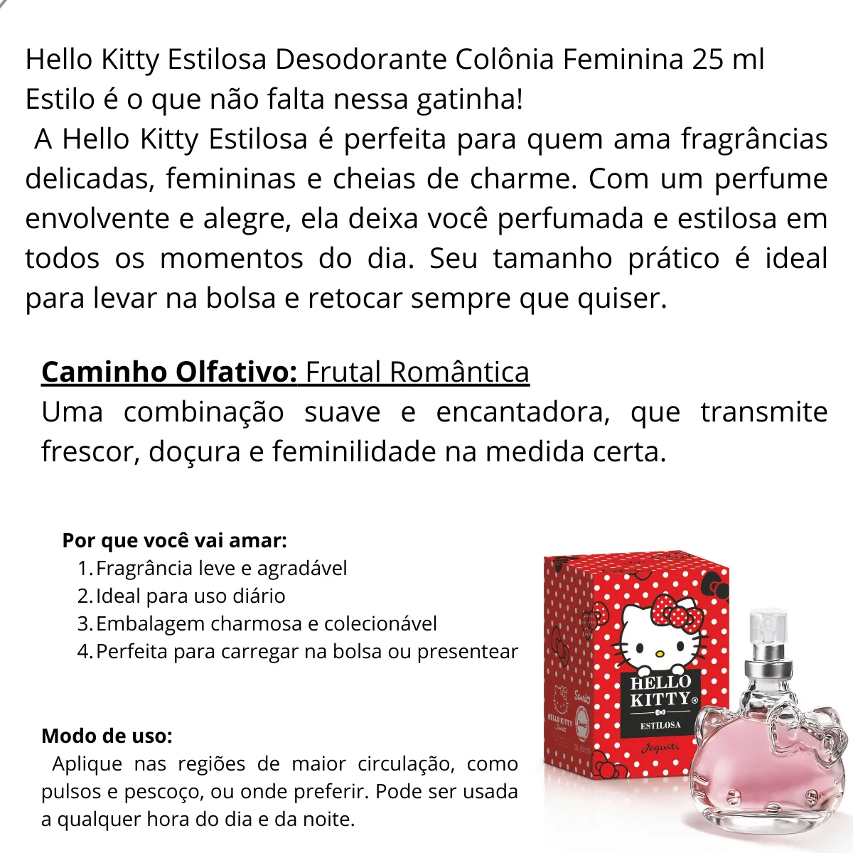 • Design Colecionável: O frasco é um fofura à parte! Com a silhueta icônica da Hello Kitty, ele decora a penteadeira e é o item dos sonhos para qualquer fã da marca.